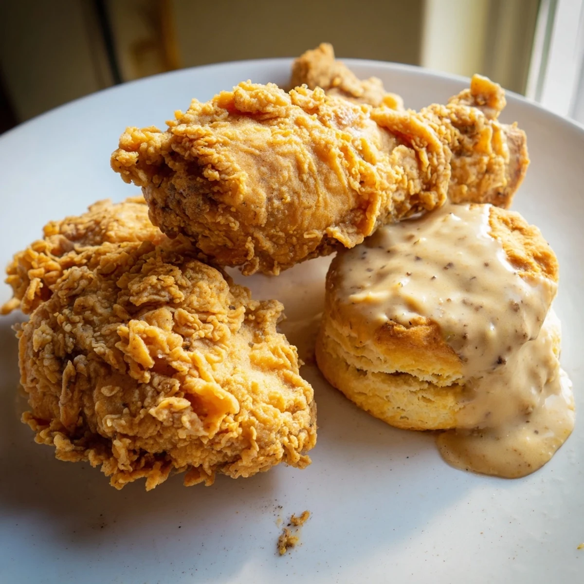 - Serviere das knusprige Hähnchen mit warmen Biskuits und übergieße alles großzügig mit der pfeffrigen Soße.